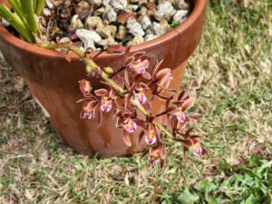 水やり中にアマガエル発見。なにやら指揮者みたいに木を持ってかわいい。シンビジウムの花が静かに咲きました✨ツツジが今日もキレイです。